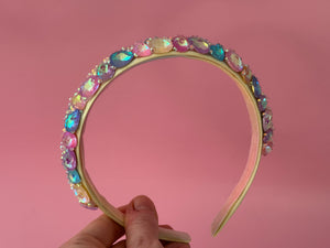 Candy Rainbow deluxe crystal Headband on a soft yellow satin base using high using quality glass rhinestones/crystals in a crown style.