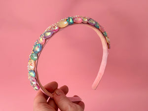Candy Rainbow deluxe crystal Headband on a soft pink satin base using high using quality glass rhinestones/crystals in a crown style.