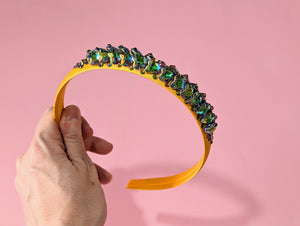 Deluxe halloween glass crystal crown on a bright golden yellow satin base using high using quality glass rhinestones/crystals.