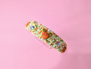 Deluxe halloween crystal pumpkin headband on a sparkly light green base using high using quality glass & resin rhinestones,crystals, pearls & embellishments