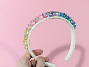 Crystal Headband crystals on a white iridescent base using high using quality glass rhinestones/crystals.