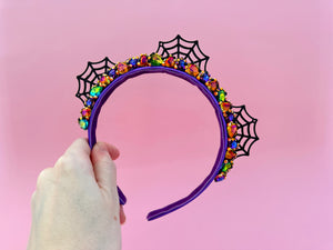 Halloween Cobwebs crystal Headband on a purple satin base using high using quality glass rhinestones/crystals in a crown style.