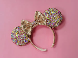 Champagne Bubbles Crystal Mouse Ears bedazzled in glass & high quality resin rhinestones on a champagne sequin base