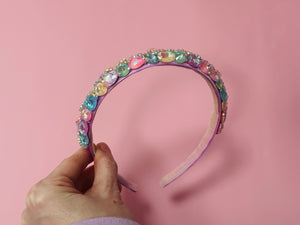 Candy Rainbow deluxe crystal Headband on a purple satin base using high using quality glass rhinestones/crystals in a crown style.