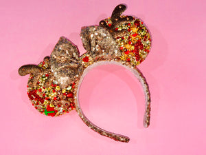 Let it Sleigh Christmas Mouse Ears bedazzled in glass & resin rhinestones with festive embellishments on a brown sequin base