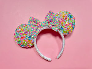 Crystal Mouse Ears bedazzled in glass & high quality resin rhinestones on a purple sequin base